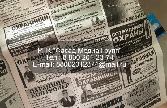 РПК «Фасад Медиа Групп» размещает рекламу в газетах. Реклама в газетах представляет собой текстовое рекламное объявление, сопровождаемое небольшой по размеру фотографией. Размещение рекламы в газете осуществляется минимум на 1 неделю. Стоимость такого размещения невысока. Для размещения рекламы в газетах обращайтесь в нашу рекламную компанию. Будем рады сотрудничеству