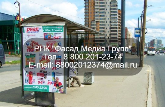 РПК «Фасад Медиа Групп» разместило рекламу на остановках для нашего клиента гипермаркета «Реал». Популярность рекламы на остановках объясняется хорошей заметностью плаката и относительно невысокими ценами размещения рекламы. Минимальный период аренды составляет 15 дней. Печать и монтаж плаката оплачиваются отдельно